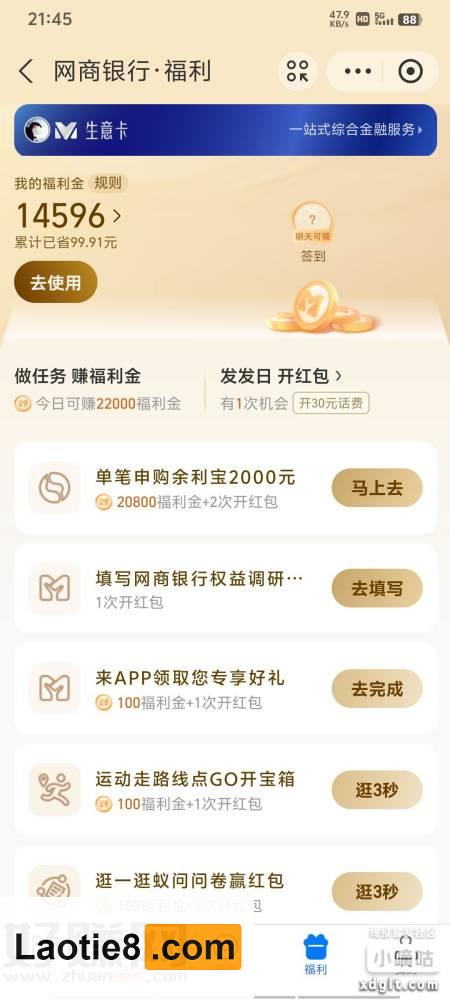 zfb-我的-网商银行-福利 持家老铁 • 2025年2月9日 pm10:02 • 时时线报 • 阅读 9 淘宝捡漏群 点击这里加入本站QQ群、线报群、微信群一起交流参加各种活动项目和线报 zfb-我的-网商银行-福利单笔转入1000 2000 分别奖励1w和2w+福利金=3元小毛 点此加入老铁吧线报推送QQ群:1004763262 点击这里加入本站QQ群、线报群、微信群一起交流参加各种活动项目和线报 京东神车bug群