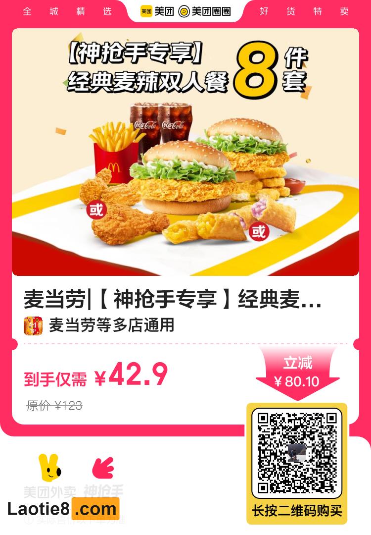 美团外卖券 42.9元,麦当劳经典麦辣双人8件套套餐兑换券·1张 持家老铁 • 2025年3月2日 am11:05 • 时时线报 • 阅读 10 淘宝捡漏群 点击这里加入本站QQ群、线报群、微信群一起交流参加各种活动项目和线报 【外卖】麦当劳|【神抢手专享】经典麦辣双人8件套套餐兑换券·1张|多店可用门市价123元现价仅需42.9元多店可用 点此加入老铁吧线报推送QQ群:1004763262 点击这里加入本站QQ群、线报群、微信群一起交流参加各种活动项目和线报 京东神车bug群