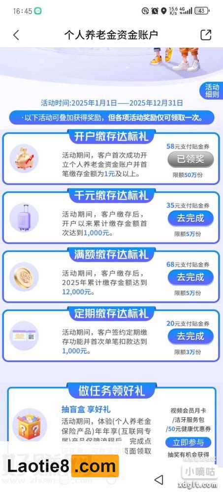 养老金账户毛: 持家老铁 • 2025年4月23日 pm5:07 • 时时线报 • 阅读 7 淘宝捡漏群 点击这里加入本站QQ群、线报群、微信群一起交流参加各种活动项目和线报 养老金账户毛:先去A行申请转移再去B行开养老金账户(APP可以直接申请)返回A行转移资金到B账户 交行58,其他银行自测 点此加入老铁吧线报推送QQ群:1004763262 点击这里加入本站QQ群、线报群、微信群一起交流参加各种活动项目和线报 京东神车bug群