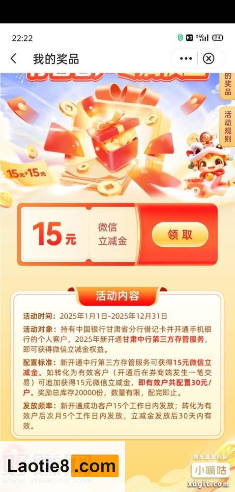 活动对象:持有中国银行甘肃省分行借记卡并开通手机银 持家老铁 • 2025年5月1日 pm10:42 • 时时线报 • 阅读 15 淘宝捡漏群 点击这里加入本站QQ群、线报群、微信群一起交流参加各种活动项目和线报 活动对象:持有中国银行甘肃省分行借记卡并开通手机银行的个人客户,2025年新开通甘肃中行第三方存管服务,即可获得微信立减金权益。 点此加入老铁吧线报推送QQ群:1004763262 点击这里加入本站QQ群、线报群、微信群一起交流参加各种活动项目和线报 京东神车bug群