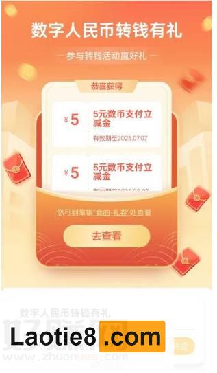农业银行app,搜索”数字人民币",-进数字钱包,点击“转钱”,向个人其它数币钱包完成一笔转账,转钱成功后,会弹窗数而转钱有礼活动窗口,点击即可领取10元数币红包,
