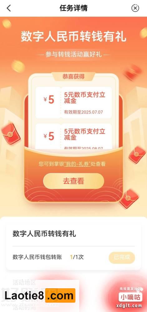 农业银行app,搜索.数字人民币.,-进数字钱包,点击.转钱.,向个人其它数币钱包完成一笔转账,转钱成功后,会弹窗数币转钱有礼活动窗口,点击即可领取10元数币红包。