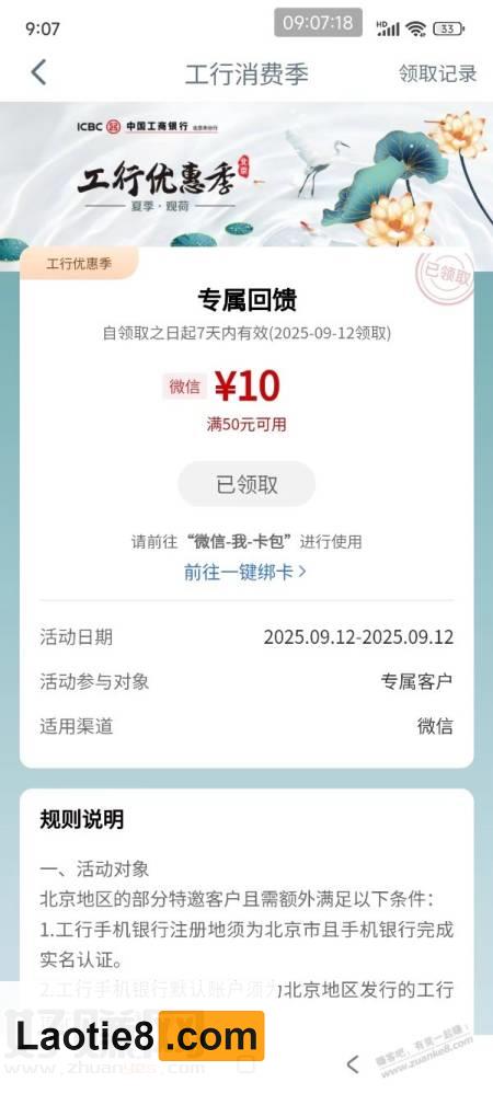 [ 工行北分 ]10元微信立减金,都去账户看看~ 持家老铁 • 2025年9月12日 am10:24 • 时时线报 • 阅读 7 淘宝捡漏群 点击这里加入本站QQ群、线报群、微信群一起交流参加各种活动项目和线报 活动路径:工行APP搜索“工行消费季” 本次范围有调整,之前没有的小号这周有,大家试试~ 点此加入老铁吧线报推送QQ群:1004763262 点击这里加入本站QQ群、线报群、微信群一起交流参加各种活动项目和线报 京东神车bug群