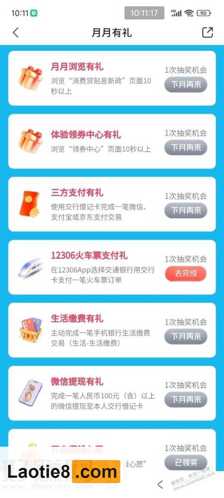 [ 交行 ]1元支付券~ 持家老铁 • 2025年9月30日 am10:19 • 时时线报 • 阅读 11 淘宝捡漏群 点击这里加入本站QQ群、线报群、微信群一起交流参加各种活动项目和线报 活动路径:交通APP活动中心——月月有礼 月初任务都做完了,今天偶然发现新增了一个“消费贷贴息新政”浏览任务,然后抽到1元立减金 点此加入老铁吧线报推送QQ群:1004763262 点击这里加入本站QQ群、线报群、微信群一起交流参加各种活动项目和线报 京东神车bug群