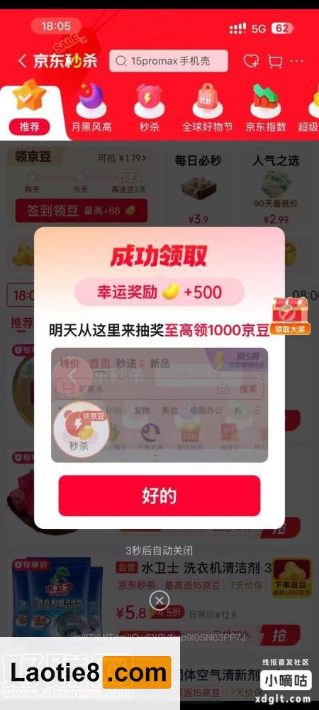 京东app,我的-京豆-右上角立即签到,进入页面后会弹出一个 持家老铁 • 4小时前 • 时时线报 • 阅读 3 淘宝捡漏群 点击这里加入本站QQ群、线报群、微信群一起交流参加各种活动项目和线报 京东app,我的-京豆-右上角立即签到,进入页面后会弹出一个窗口说触发抽奖,然后点一下抽奖,大概率中500豆子,然后自动跳转首页,进入秒杀页面领取 点此加入老铁吧线报推送QQ群:1004763262 点击这里加入本站QQ群、线报群、微信群一起交流参加各种活动项目和线报 京东神车bug群