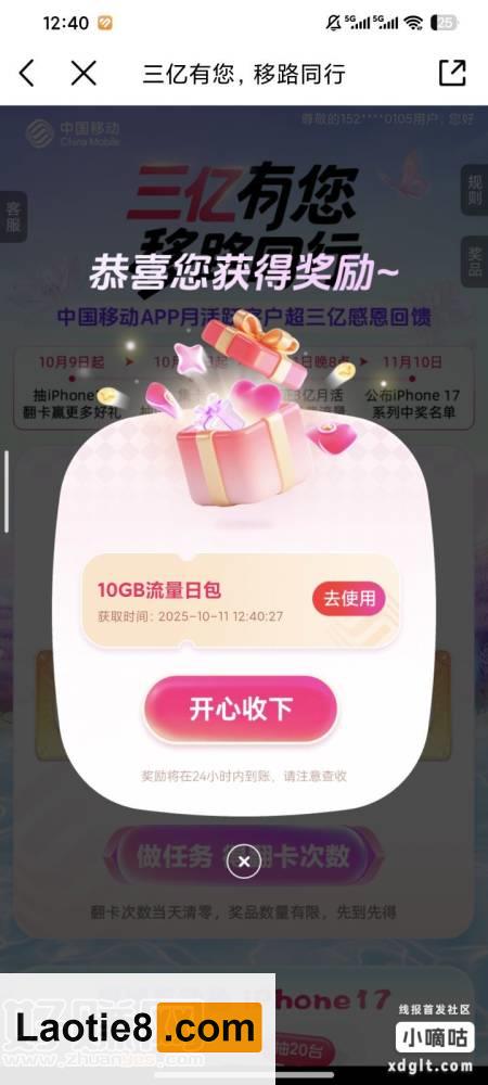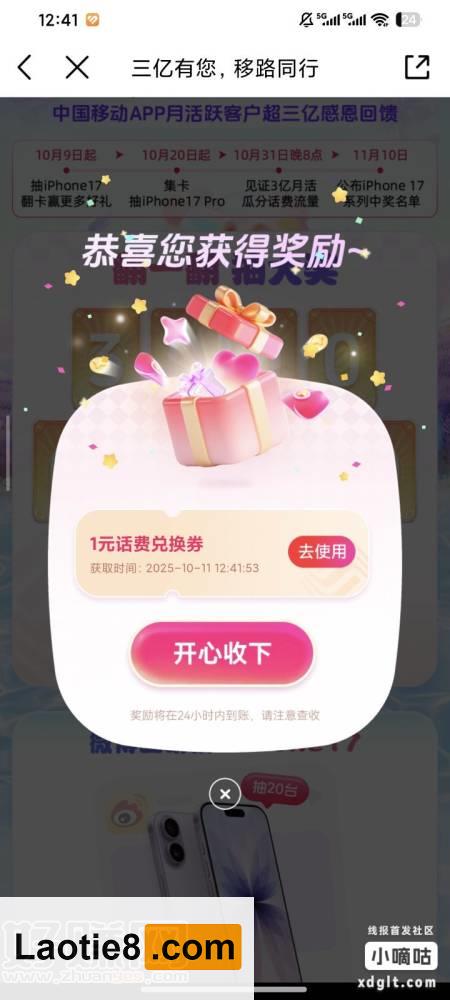 移动话费流量 持家老铁 • 4小时前 • 时时线报 • 阅读 2 淘宝捡漏群 点击这里加入本站QQ群、线报群、微信群一起交流参加各种活动项目和线报 移动话费流量移动APP顶部,(互动送iPhone 17)没入口的扫图二刚中10GB和1话费 点此加入老铁吧线报推送QQ群:1004763262 点击这里加入本站QQ群、线报群、微信群一起交流参加各种活动项目和线报 京东神车bug群