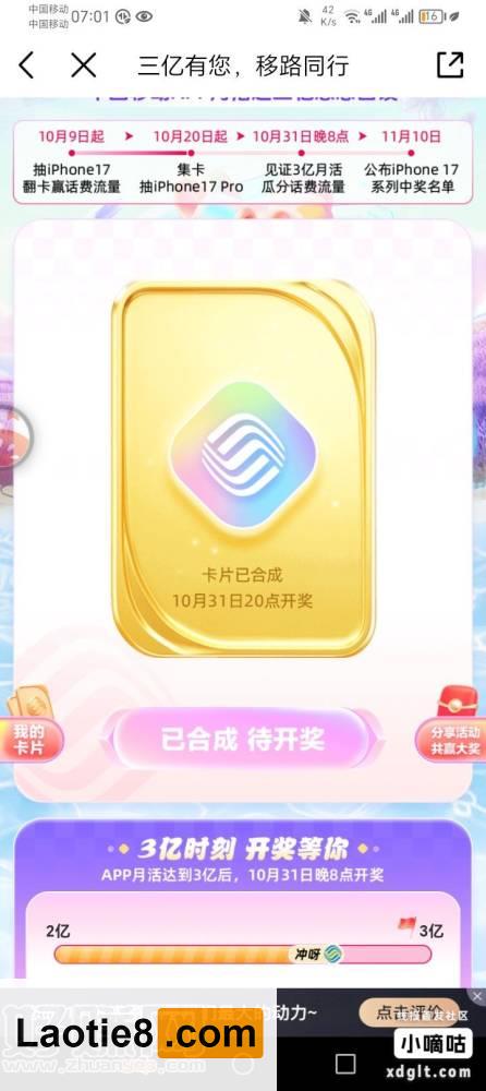 你们中国移动(三亿有你)集好了没?碰碰运气说不定中苹果呢 持家老铁 • 3小时前 • 时时线报 • 阅读 1 淘宝捡漏群 点击这里加入本站QQ群、线报群、微信群一起交流参加各种活动项目和线报 你们中国移动(三亿有你)集好了没?碰碰运气说不定中苹果呢 点此加入老铁吧线报推送QQ群:1004763262 点击这里加入本站QQ群、线报群、微信群一起交流参加各种活动项目和线报 京东神车bug群