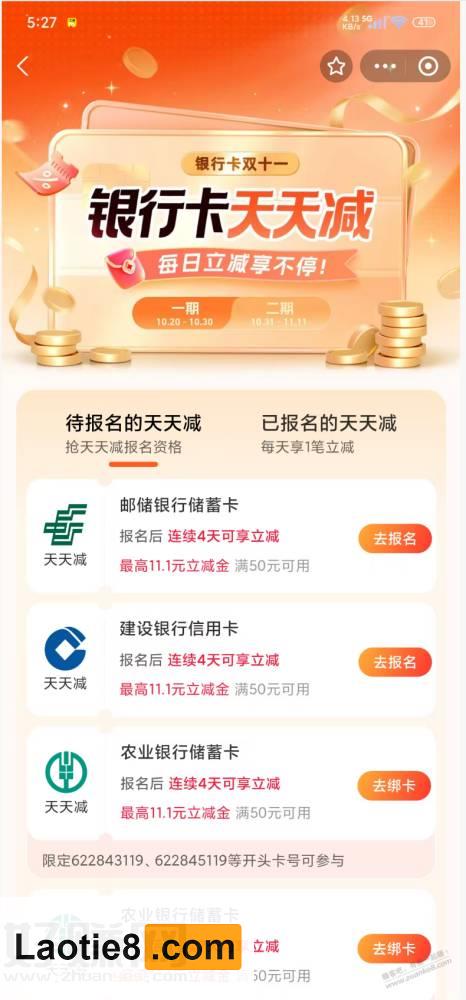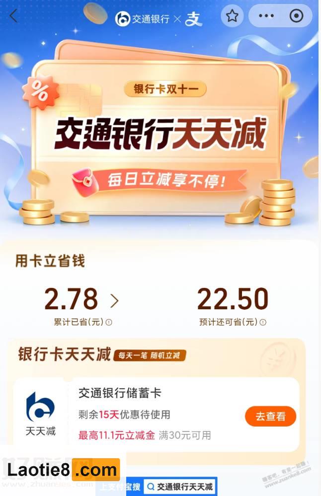 支付宝,银行卡立减,银行卡天天减 持家老铁 • 3小时前 • 时时线报 • 阅读 4 淘宝捡漏群 点击这里加入本站QQ群、线报群、微信群一起交流参加各种活动项目和线报 支付宝搜【银行卡天天减】参加活动 还款可用 点此加入老铁吧线报推送QQ群:1004763262 点击这里加入本站QQ群、线报群、微信群一起交流参加各种活动项目和线报 京东神车bug群