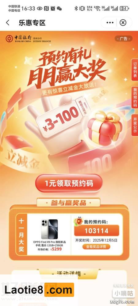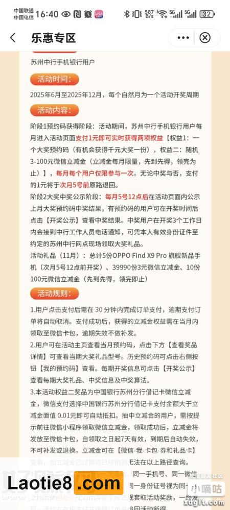 苏州地区,中行APP,生活-乐惠苏州滚动横幅预约有礼支付一元 持家老铁 • 18小时前 • 时时线报 • 阅读 1 淘宝捡漏群 点击这里加入本站QQ群、线报群、微信群一起交流参加各种活动项目和线报 苏州地区,中行APP,生活-乐惠苏州滚动横幅预约有礼支付一元得3微信立减金和抽奖机会,当期活动结束无论是否中奖一元原路返回 点此加入老铁吧线报推送QQ群:1004763262 点击这里加入本站QQ群、线报群、微信群一起交流参加各种活动项目和线报 京东神车bug群