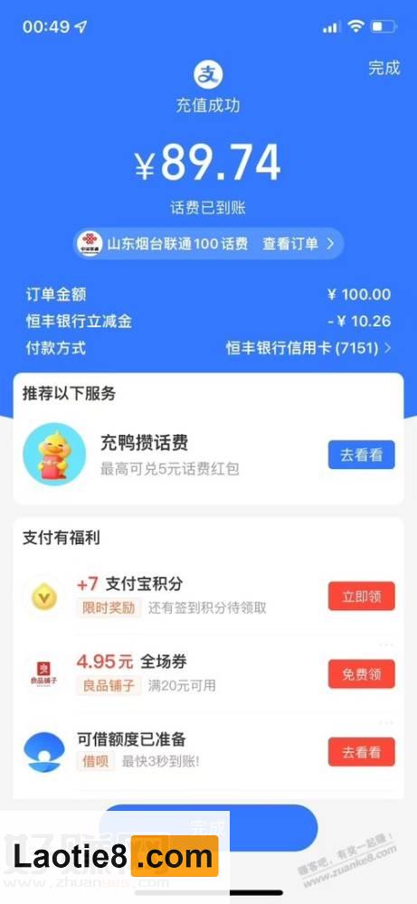 恒丰xing卡利剑10毛多 持家老铁 • 13小时前 • 时时线报 • 阅读 0 淘宝捡漏群 点击这里加入本站QQ群、线报群、微信群一起交流参加各种活动项目和线报 刚点了下充话费默认点了一百一看蹦出来立减10下了我一跳这什么鬼,下面还有个烟台立减个多我反正是用了,连那个烟台卡我也用了 点此加入老铁吧线报推送QQ群:1004763262 点击这里加入本站QQ群、线报群、微信群一起交流参加各种活动项目和线报 京东神车bug群