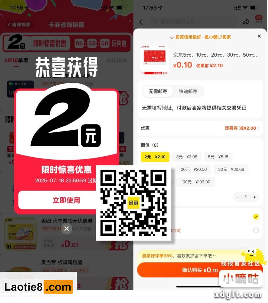 咸鱼APP扫码,或 https://pages.goofish.com/sharex … hort_name=h.S6IbogW 自动弹2亓红包,搜索“E卡”可0.1亓买2亓京东E卡