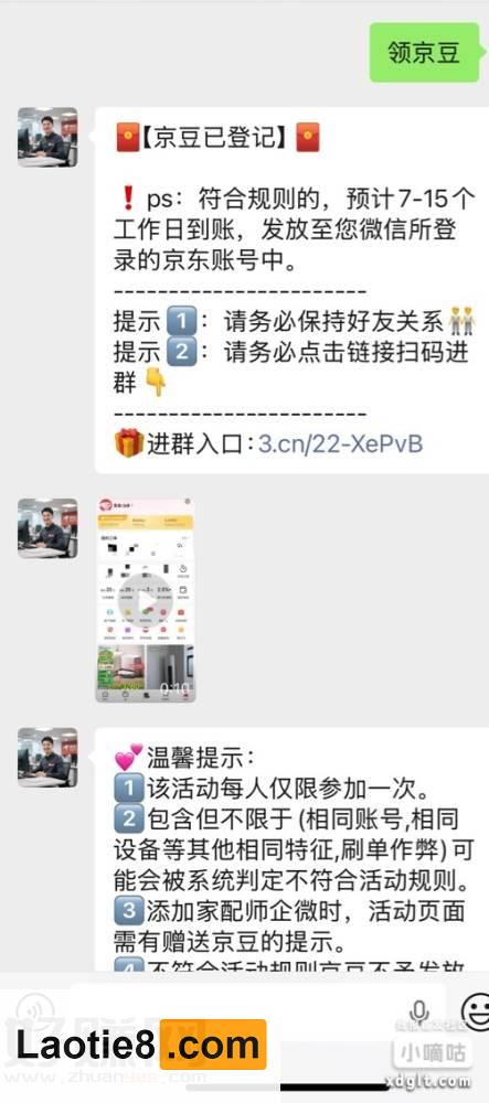 京东家配,首次添加回复[ 领京豆 ], 能拿400豆子。 持家老铁 • 1小时前 • 时时线报 • 阅读 0 淘宝捡漏群 点击这里加入本站QQ群、线报群、微信群一起交流参加各种活动项目和线报 京东家配,首次添加回复【领京豆】, 能拿400豆子。邀请好友加企V,邀请一位用户也能得300京豆 上限邀请10人 得3000豆子【邀请请发邀请帖】感兴趣的可以参与哈 点此加入老铁吧线报推送QQ群:1004763262 点击这里加入本站QQ群、线报群、微信群一起交流参加各种活动项目和线报 京东神车bug群