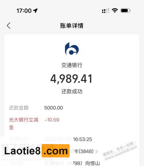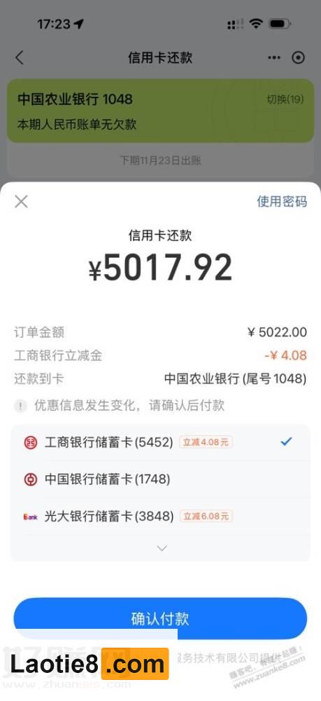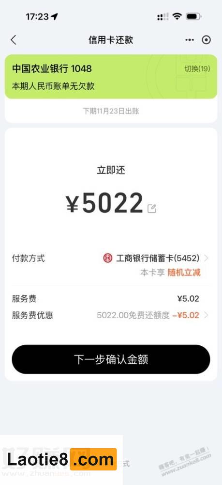 支付宝还款光大5000-10 持家老铁 • 4小时前 • 时时线报 • 阅读 0 淘宝捡漏群 点击这里加入本站QQ群、线报群、微信群一起交流参加各种活动项目和线报 如题,自测至少有两次,5000-10,5000-6,工行也有-4,确定还款之前是显示随机,点击确定付密码的时候才会真正显示立减金额。支付宝钻石会员每个月50000还款额度,钻石不需要手续费 点此加入老铁吧线报推送QQ群:1004763262 点击这里加入本站QQ群、线报群、微信群一起交流参加各种活动项目和线报 京东神车bug群